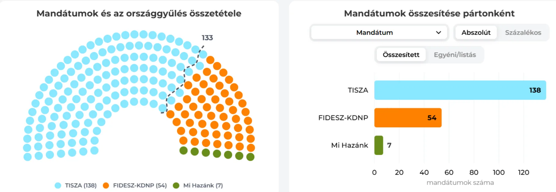 Közel teljes feldolgozottságnál a Tisza Párt a szavazatok több mint 53 százalékát szerezte meg, ami a mandátumok tekintetében 138 képviselői helyet jelenthet az új Országgyűlésben. Ez nemcsak kétharmados többséget jelent, hanem minden korábbi eredményt felülmúl: még a korábbi rekordot tartó Fidesz–KDNP-kétharmadnál is több mandátumot hozott. Négy választókerületben egyelőre még a Fidesz áll jobban, de ezek az összes szavazat feldolgozásával átfordulhatnak, így elképzelhető, hogy 140 mandátum felett lesz a végleges eredmény.
